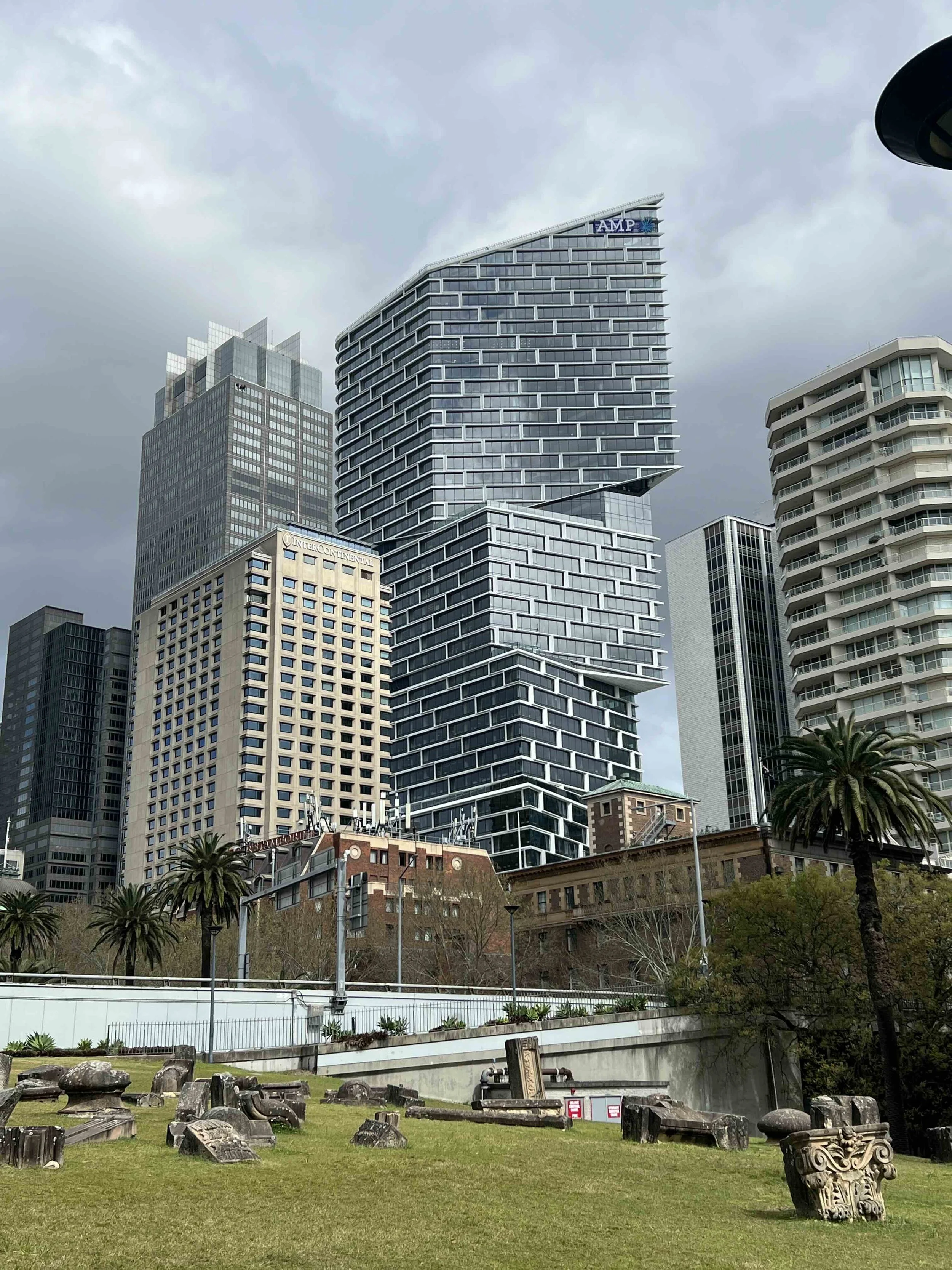 It’s called ‘Memory is Creation Without End.’ Tsuchiya has taken relics from demolished buildings in Sydney, salvaging and reconfiguring them. When you walk up this hill, you see the past with a backdrop of the present and future: the huge skycrapers and pieces of buildings in Sydney’s past.